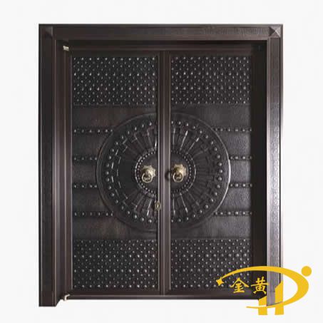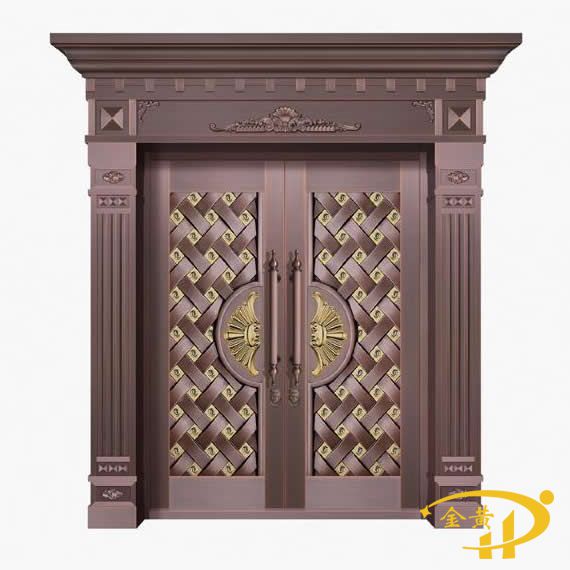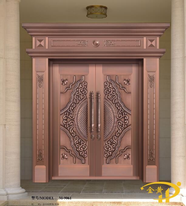 本款豪華雙開(kāi)別墅門(mén),型號(hào)是M-9025,門(mén)面采用整板模壓工藝,原材料為洛陽(yáng)純紫銅或黃銅制作而成。